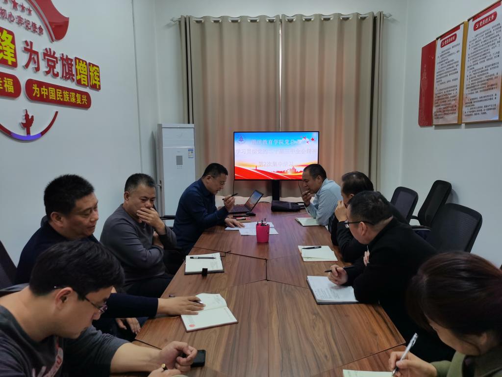 2024年11月20日下午,继续教育学院党总支学习贯彻党的二十届三中全会精神第2次集中学习在党员活动室进行,集中学习由党支部书记钱中华主持,学院副科级及以上干部参加。